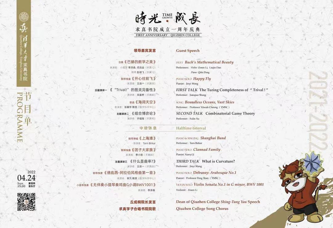 在蒙民伟音乐厅举行成立一周年庆祝会。本次活动以“时光·成长”为主题,融合学生的学术演讲和师生艺术表演,用科学与艺术的完美结合体现数学的至真至美。第一版主