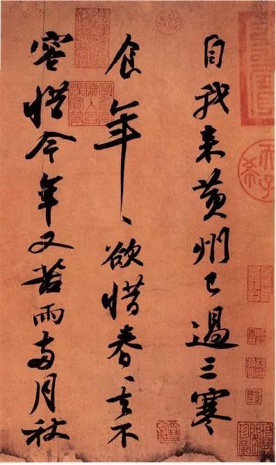 苏东坡书迹流传较多,《黄州寒食诗》为其代表作之一。情感的变化寓于参差错落、变化无端的点画线条中,书风抑郁苍凉,与心境正相呼应。