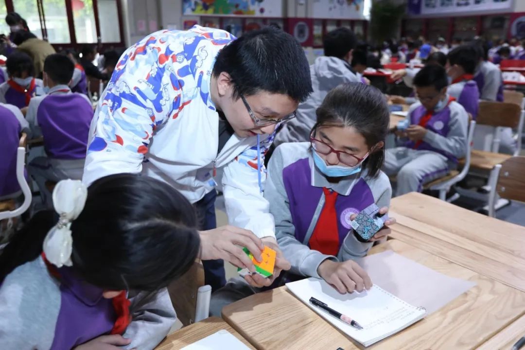 对魔方充满兴趣并乐于其中的学生不在少数,今天他们中的七位同学来到了现场,和清华附小的学生们组队,带领和指导小同学们学习魔方的还原。现场浓厚而热烈的学习、交流氛围让人印象深刻。