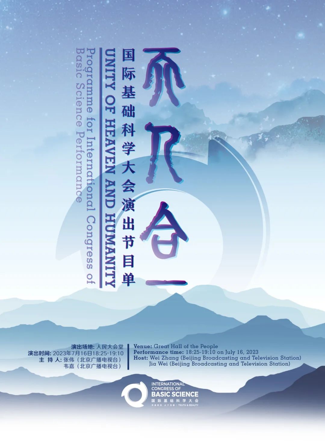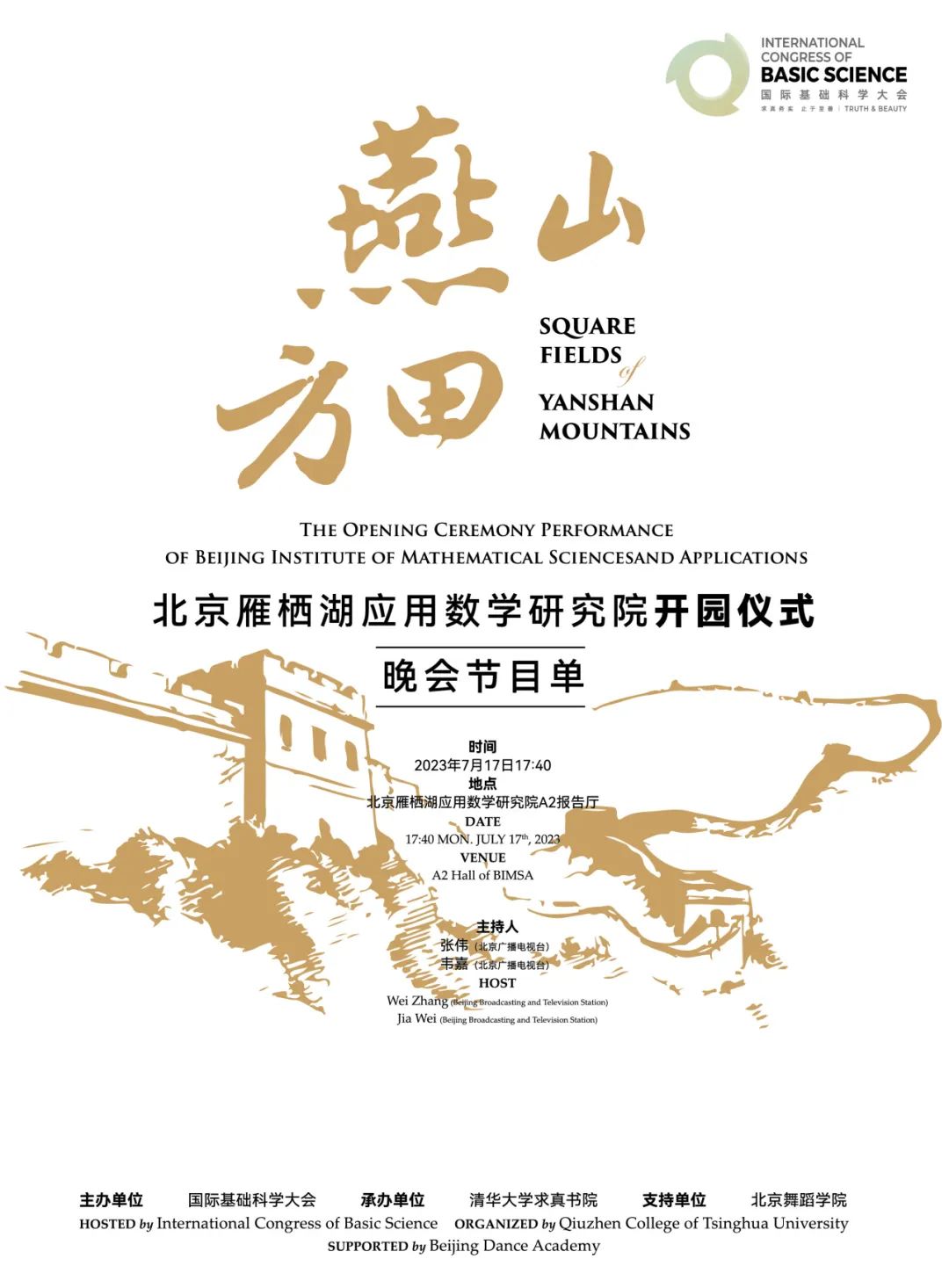 2023年7月16日下午,庆祝国际基础科学大会顺利开幕的【天人合一】主题文艺演出在北京人民大会堂举行;7月17日晚上,庆祝北京雁栖湖应用数学研究院新院址开园的【燕山方田】文艺演出在该研究院A2报告厅成功举办。在两场重要文艺演出中,第一版主