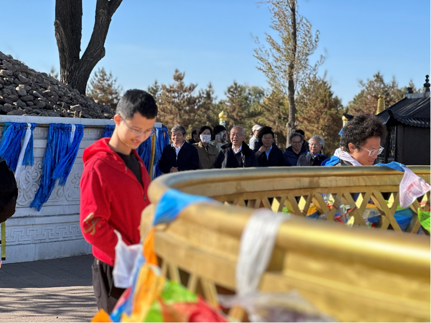 随后大家又参观了阿勒腾甘德尔敖包。为了纪念成吉思汗,每年农历三月二十一蒙古族人民会在此洒鲜奶举行隆重的祭祀仪式。跟随着蒙古族传统文化,大家绕着敖包步行三圈,为家人、朋友祈福平安顺遂。