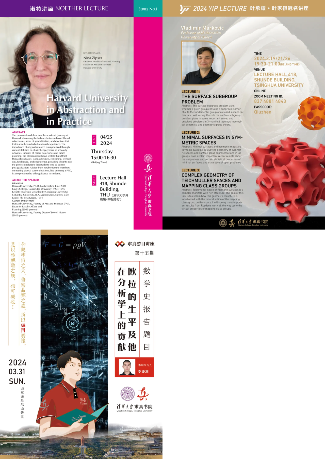 成功举办了第三届Pi节挑战赛,着力提升学生提出问题和解决问题的能力,并增强与中学生的交流。在丘成桐院长的倡导下,书院在2月29日至3月6日征集了创意命题,吸引了大量本研学生参与。这些命题不仅展示了求真学生们的数学深度,也体现了他们对数学的热爱和探索精神。挑战赛在3月16日进行,吸引了45所中学的参与,收到280份优秀答卷,显示出各校对数学教育的重视。4月1日,在丘成桐先生《数学史》课上,第一版主