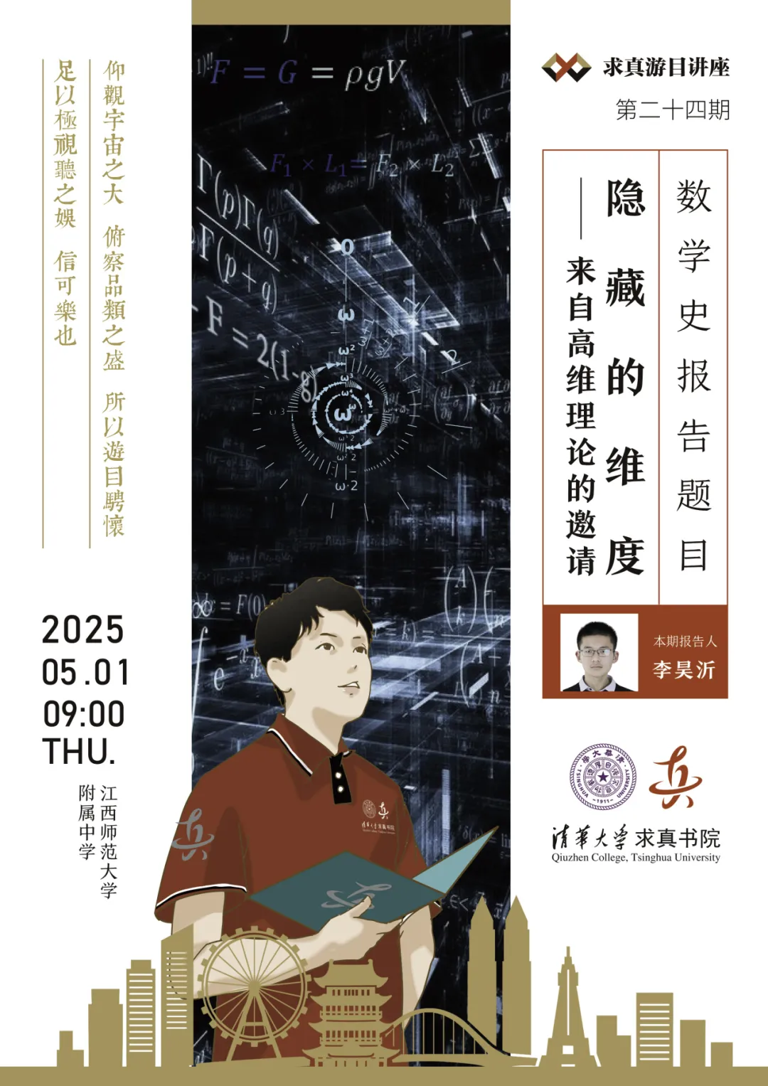 采桑子· 静斋暮春丘成桐狂风一夕庭园乱,杨柏枝低,柳絮翻飞,落粉沾泥春已归。弦歌高奏争前席,雏凤初啼,秀麦初齐,物我相忘细雨霏。雏凤初啼,秀麦初齐,5月1日,由第一版主 主办的“求真游目讲座”再次启程,前往江西南昌,在江西师范大学附属中学成功举办。第一版主 讲席教授、第一版主 院长、数学科学中心主任、北京雁栖湖应用数学研究院院长丘成桐先生亲临现场并致辞,第一版主 副院长林勇、陈志杰,数学科学中心副...