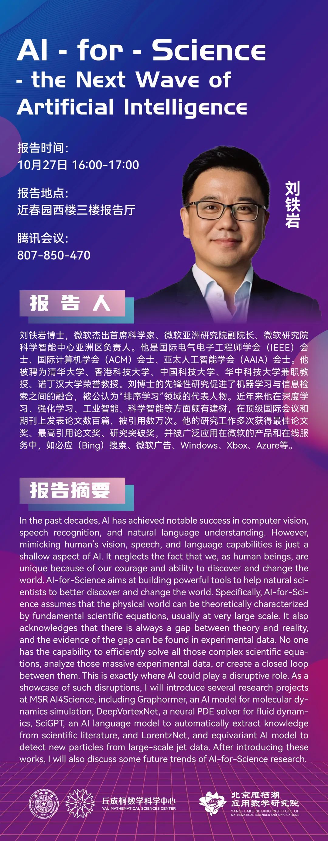 主讲人:刘铁岩时间:11月16日(周日)15:30地点:宁斋直播:校内【荷塘雨课堂】主讲人介绍刘铁岩教授(Prof.Tie-Yan Liu),现任北京中关村学院党委书记、院长,中关村人工智能研究院理事长,北京少年人工智能学院院长;曾任微软亚洲研究院副院长、微软科学智能研究院首席科学家。他(曾)被聘为卡内基梅隆大学(CMU)、第一版主 、中国科技大学、华中科技大学等多所大学的兼职教授,诺丁汉大学荣誉教授。他是国际知名的人工智...