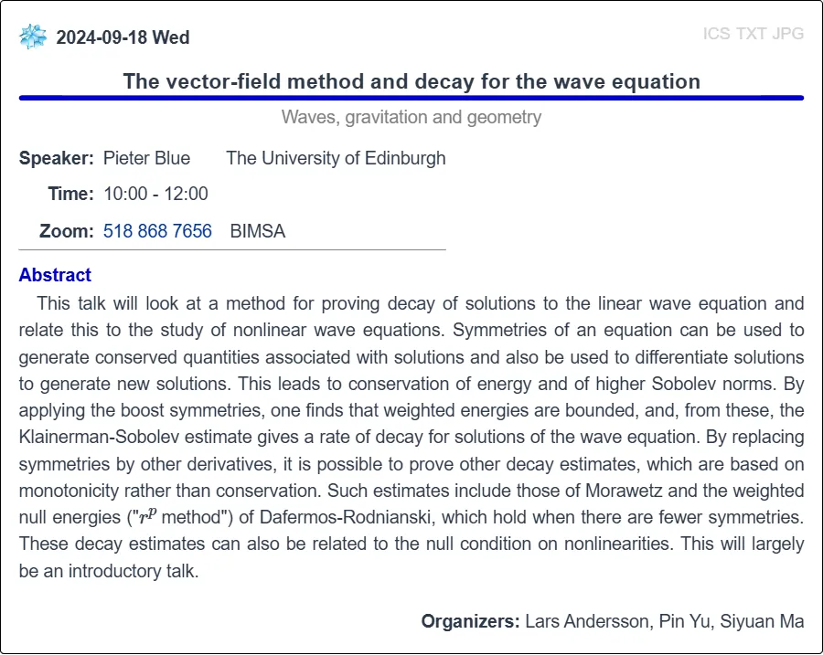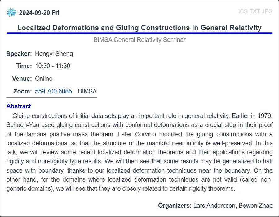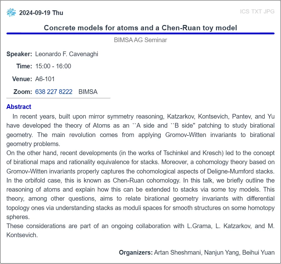 2022-11-21 MonThe $Delta$-twisted homology and fiber bundle structure of twisted simplicial setsBIMSA Topology SeminarSpeaker: Mengmeng Zhang Hebei Normal University and BIMSATime: 15:30-17:00 Venue: 1129B Zoom: 537 192 5549(PW: BIMSA)AbstractIn this talk, I will give a brief introduction for simplicial set theory. Then I will report our recent progress for unifying $delta$-homology, introduc...