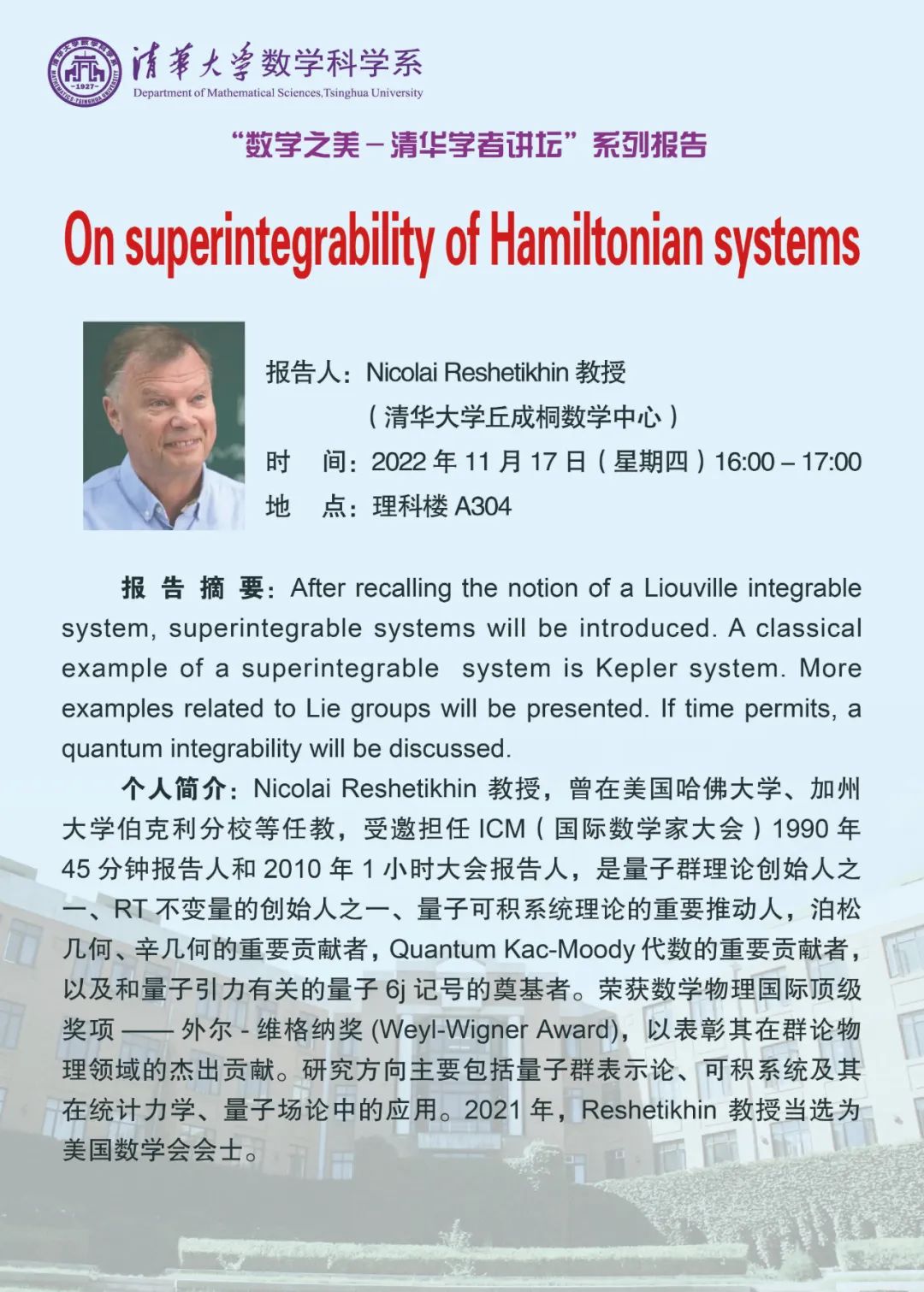 第一版主 院长丘成桐先生一直强调,一流的人才需要一流的学术大师来教导。国际数学物理顶尖学者 Nicolai Reshetikhin教授全职加入丘成桐数学科学中心,意味着第一版主 又增加一位世界一流水平导师。