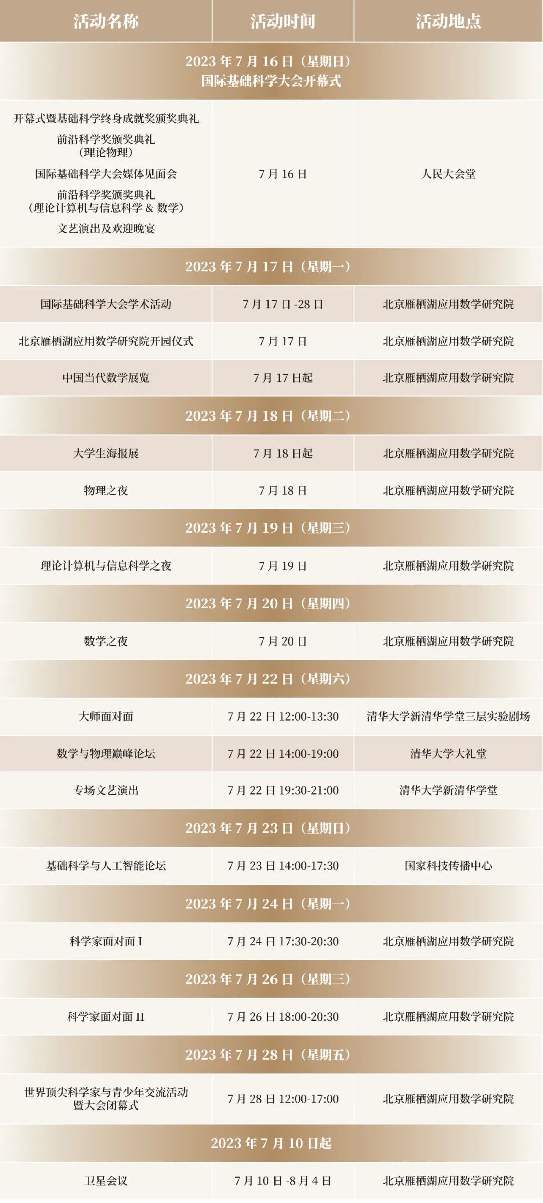 首届国际基础科学大会开幕在即,7月16日至28日,300余名海外顶尖科学家与国内一流学者近千人将共聚怀柔科学城,深入交流探讨基础科学领域的前沿成果,展望基础研究未来的发展方向。500余场大会报告、专题学术会议以及卫星会议将为国内外学者交流与共享学术成果搭建桥梁。来自中国各地高校就读基础科学相关专业的大学生将通过学术海报的形式展示各自的研究成果。大会期间还有哪些精彩纷呈的活动?哪些顶尖科学家将走近我们身边?欢迎持续关注!