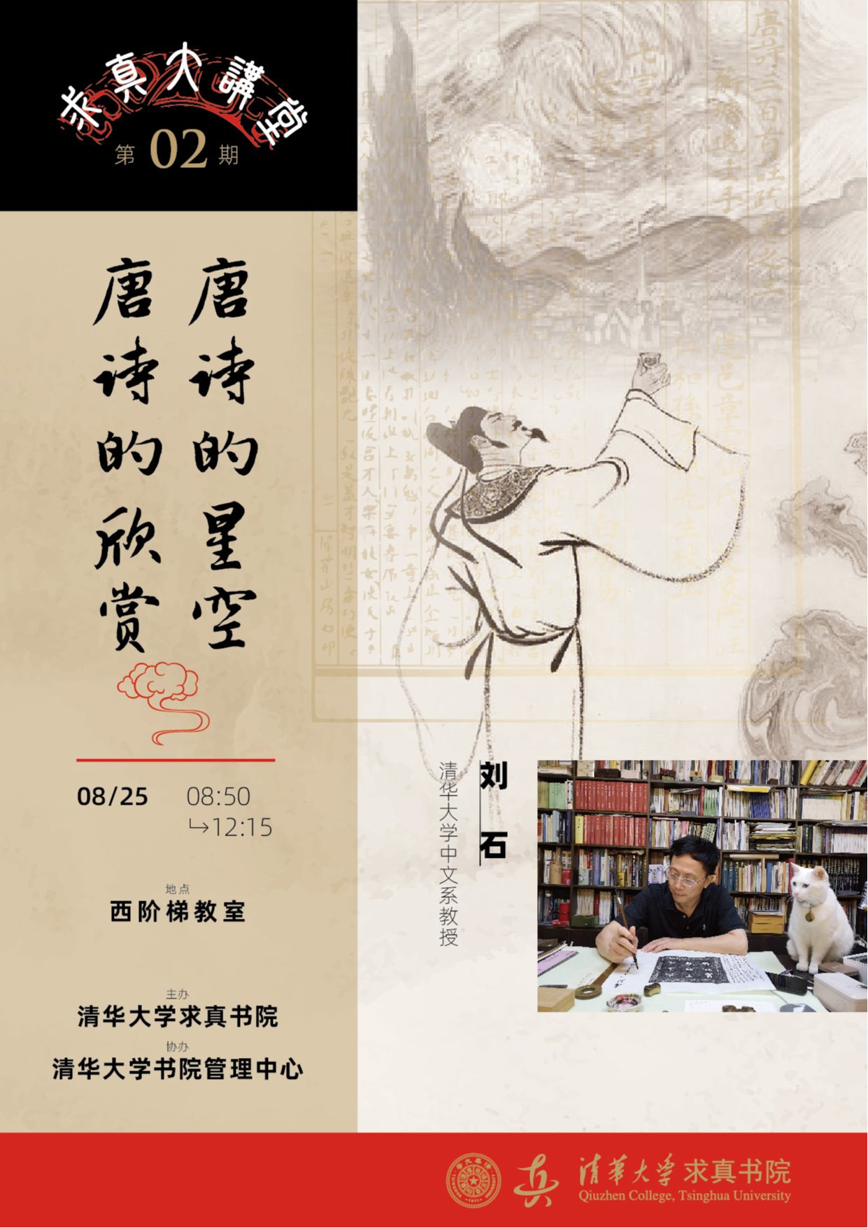 本次求真大讲堂傅教授以原文诗作为例,辅以吟诵演示,概略介绍了古希腊语、拉丁语、梵语、日语、法语、英语诸语种的诗歌形态及发展历史,涉及音律、主题、意象等基本概念和常识。