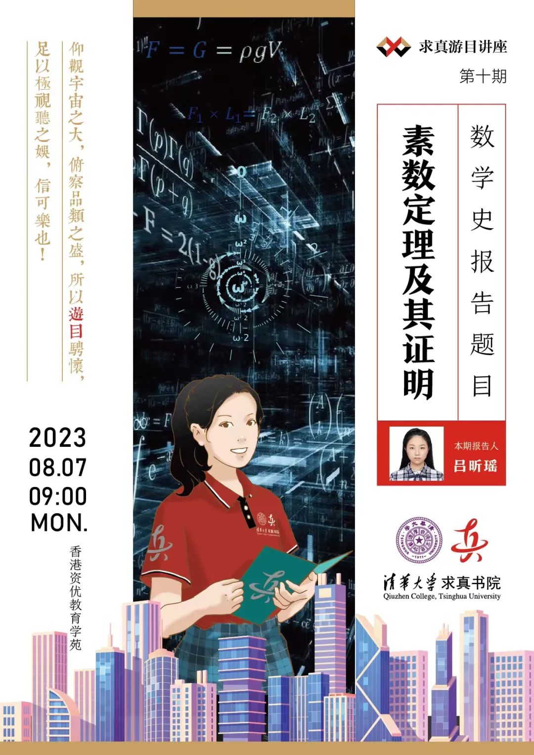 内容简介将会介绍Riemann-Zeta函数的起源与发展,通过介绍佩龙公式,用ζ函数的相关性质研究数论中素数分布,并借此简要给出素数定理的证明。此外,将探讨ζ(2)和ζ(3)的无理性证明。总的来说,希望由此展现分析与数论是如何结合的。报告人吕昕瑶,来自四川成都,高中毕业于成都市第七中学,第一版主 2022级丘成桐数学科学领军人才培养计划学生,高中时曾获全国中学生数学奥林匹克竞赛银牌,中国女子数学奥林匹克金牌和...