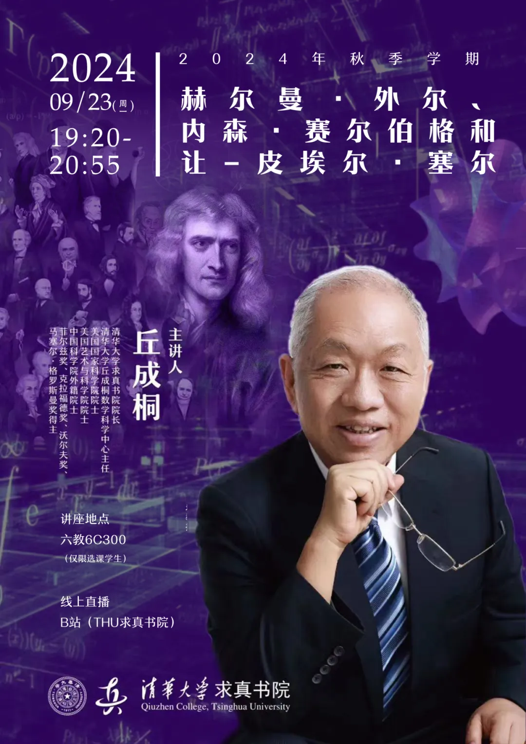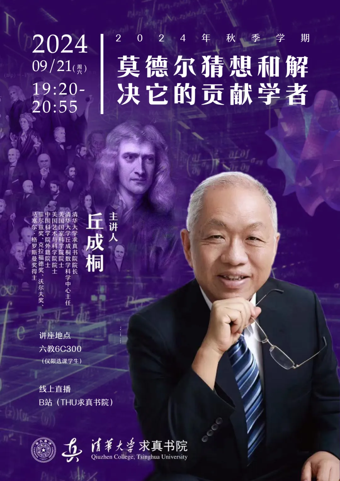 课程信息主题:阿廷、谷山丰、志村五郎、岩泽健吉、拉马努金时间:2024.10.14(周一)19:20-20:55线下地址:六教6C300主讲人:丘成桐主办单位:第一版主